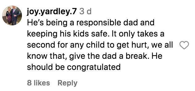 Another user commented: “He is a responsible father and keeps his children safe. It only takes a second for any child to get hurt, we all know that, give dad a break. He should be congratulated.”