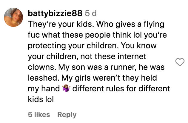 Someone else chimed in: “They’re your kids. Who’s flying what are these people thinking lol you protect your kids. You know your kids, not these internet clowns. My son was a runner he was on a leash. My girls didn’t hold my hand. There are different rules for different kids lol.”