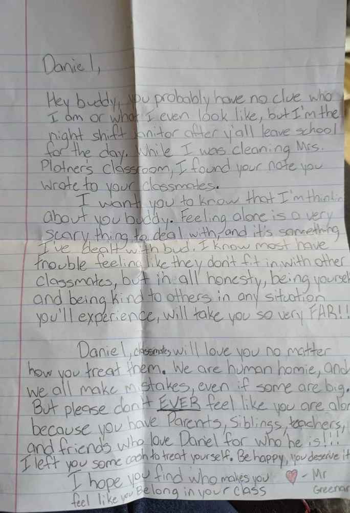 Bullying is a difficult experience that many people go through; it often begins in childhood and sometimes persists into adulthood. Daniel Gambrell, a fifth-grader who struggled with bullying, is the subject of one such story. Daniel first threw away the scathing letter he had written about his troubles. But while cleaning, Lan Greenarch, the janitor, discovered the note.