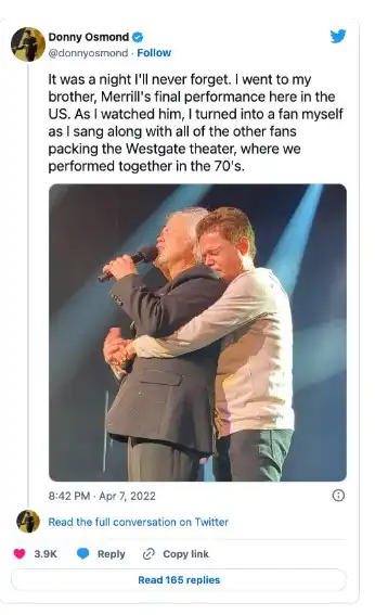 It’s lovely to see Donny and Merrill show genuine affection for each other. In addition to attending his sibling’s historic farewell show in Las Vegas, Donny also took the time to share a touching photo and heartfelt message to express his appreciation for Merrill’s continued support in his thriving career.