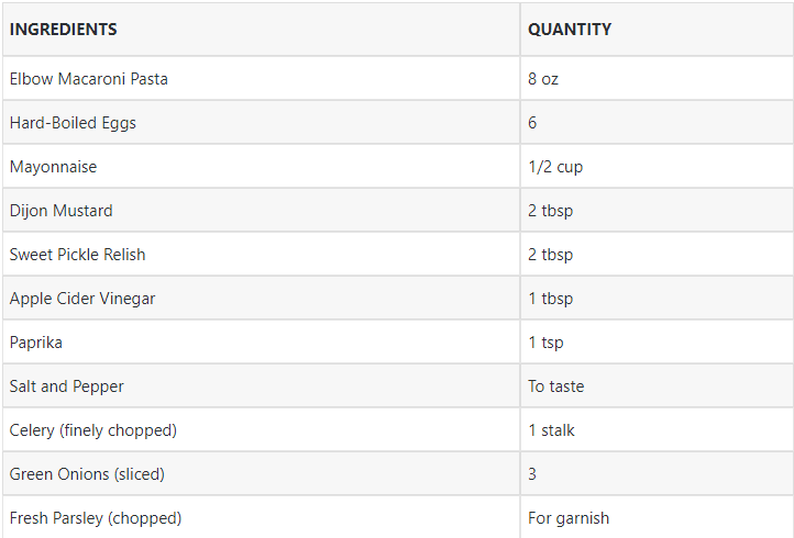 A chart with all the ingredients needed to make this delicious deviled egg pasta salad is below: