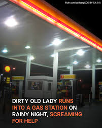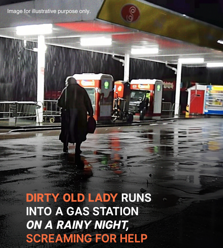 The gas station was quiet on a stormy night until an elderly woman burst in, drenched and shaking with fear.