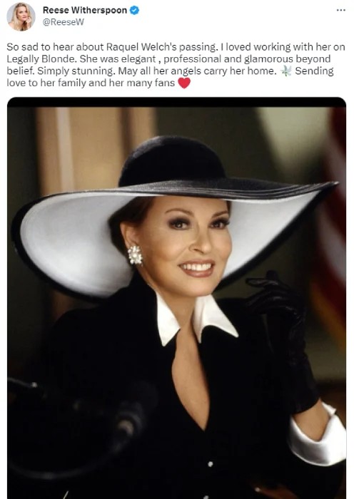 “When I heard about Raquel Welch’s passing, I was stunned. I cherished our collaboration on Legally Blonde. She was extremely intelligent, competent, and attractive. Stunningly beautiful.”