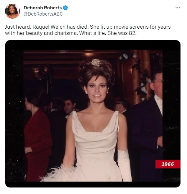 When Raquel Welch’s death was confirmed, Deborah Roberts posted a touching tweet to express her grief. Deborah, who is 82, recognized Raquel’s influence on her career.