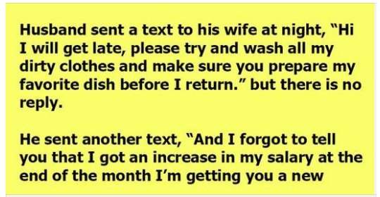 Late one evening, a spouse messaged to his better half, mentioning her to wash his grimy garments and set up his #1 dish before he got back. Shockingly, there was no answer. Courageous, he sent another message, illuminating his better half about an expansion in his compensation and his arrangements to get her another vehicle.