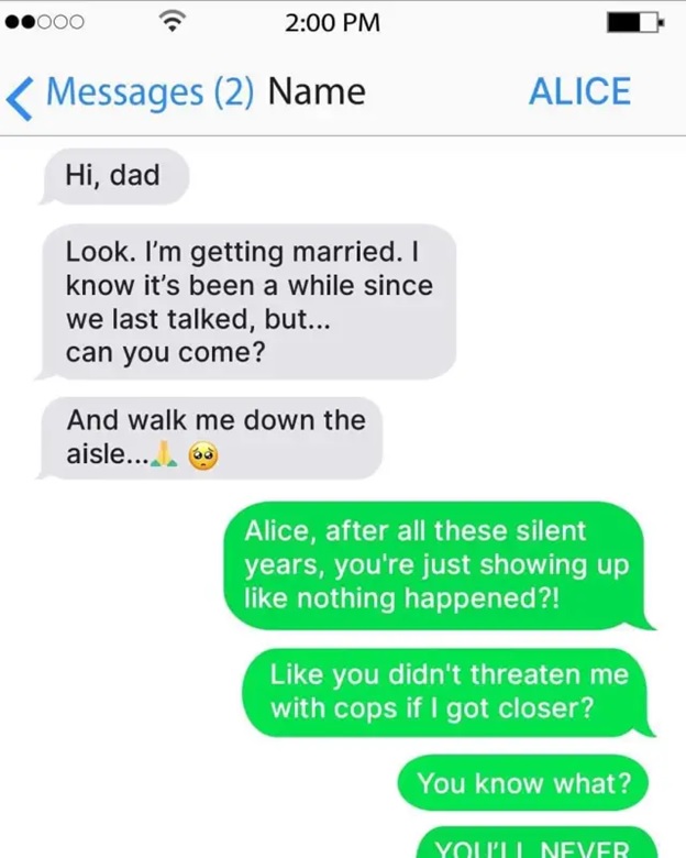 “Hey Father, this is Alice,” she began her text. “I’m going to get hitched soon and I maintain that you should walk me down the path.