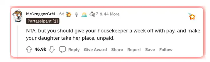 “You should pay the maid a week’s salary and let your daughter do ALL the housework for the week!” Someone wrote.