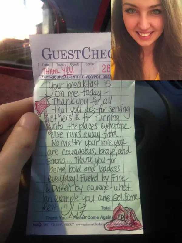 As they prepared to leave, Liz gave them a handwritten note instead of a receipt that read, “Your breakfast is on me today.” We appreciate all you do, your service to us, and your willingness to venture into areas most people avoid. You are strong, bold, and courageous in whatever capacity you play. I appreciate your daily courage.”