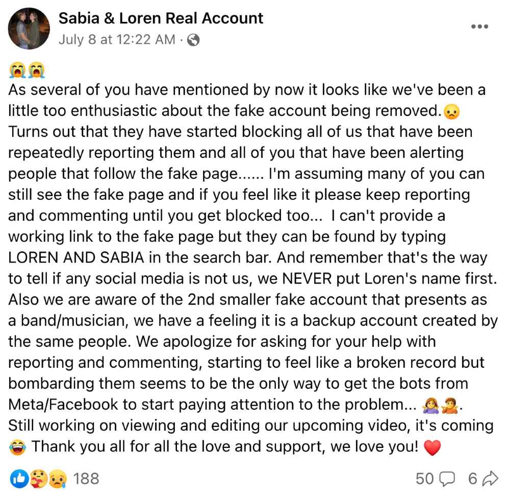 This month, they praised their fans for helping them deal with fake accounts in an official statement, adding: “As a few of you may have noticed at this point, it seems we got a little too excited about taking down the fake account. I imagine many of you may still see the fake page, so if you want to keep reporting and posting until you get banned too, please do.