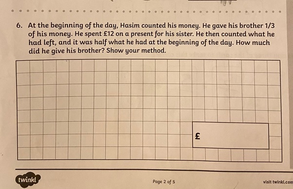Toward the start of the day, Hasim counted his cash. He gave his sibling ⅓ of his cash. He burned through £12 on a present for his sister. He then counted what he had left and it was half what he had toward the start of the day. What amount did he give his sibling?”