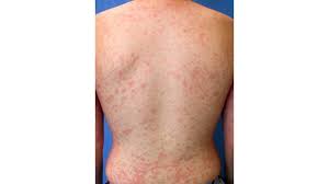 It should be obvious. an allergic reaction that causes reddened skin and an itchy rash that can be triggered by food, drugs, chemicals, or insect stings or bites.