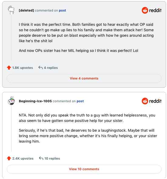 Both of OP’s families attended a pre-Thanksgiving potluck that her sister and brother-in-law hosted the weekend before she exposed her Reddit account. A few days before help came, OP stayed with her sister because she assumed her brother-in-law wouldn’t help.