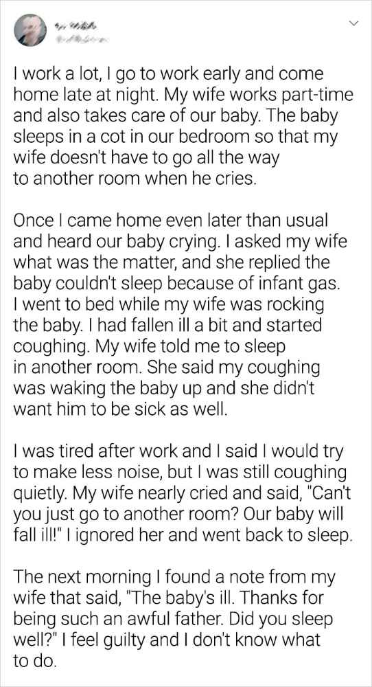 Having a baby is often a shock for some couples and can really turn the tide in their relationship. One of our readers had to decide between getting enough sleep for herself and her baby. His loved one’s emotions were thrown to a boil by the decision and our reader is now upset about it.