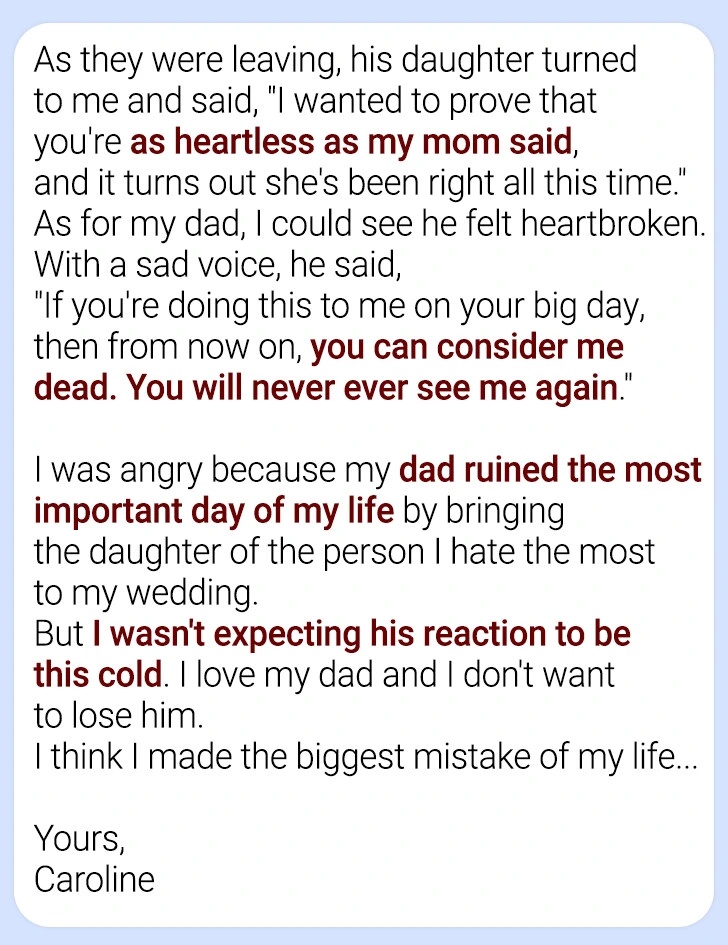 Caroline’s wedding day was supposed to be happy and carefree, but it took a sad turn when her father arrived with an unexpected visit.