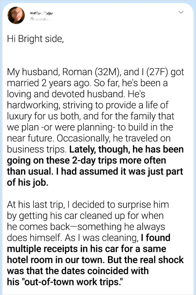But karma acts as a warning: the injury and deception committed on a partner may one day return and punish the deceiver with unthinkable consequences. That was the case with Jessica, a Bright Side reader, who was shocked by the swift action of karma after learning of her husband’s betrayal. She sent herself a letter asking for advice on what to do next.