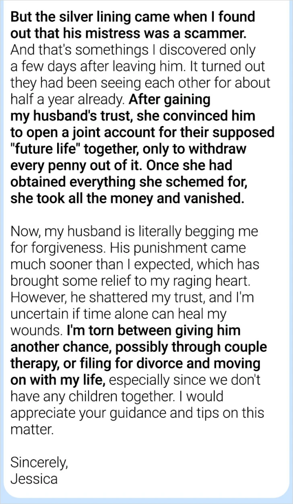 As Jessica faces such a difficult chapter, it is important for Jessica to remember that she has the power to shape her own future, regardless of the hurt caused by her husband’s actions. By focusing on her well-being and making decisions that align with her values, she can come out of this experience stronger and more confident.