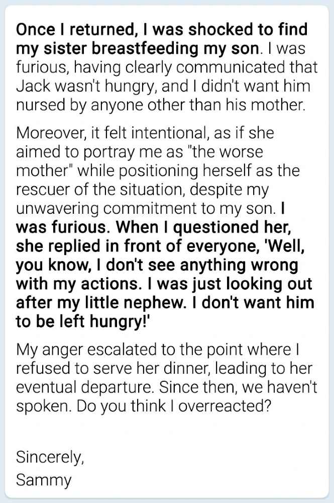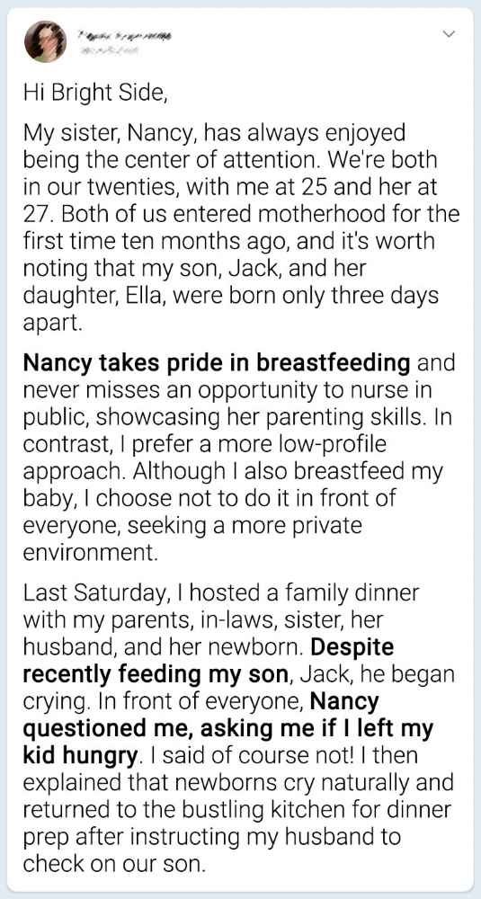 Everyone has a different parenting style, especially when it’s a first-time mother. Bright Side reader Sammy, a new mother, contacted us for advice on a sensitive matter involving her sister, whose behavior had deeply disturbed Sammy.