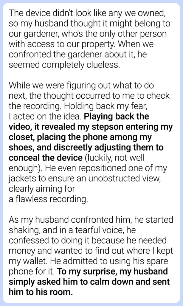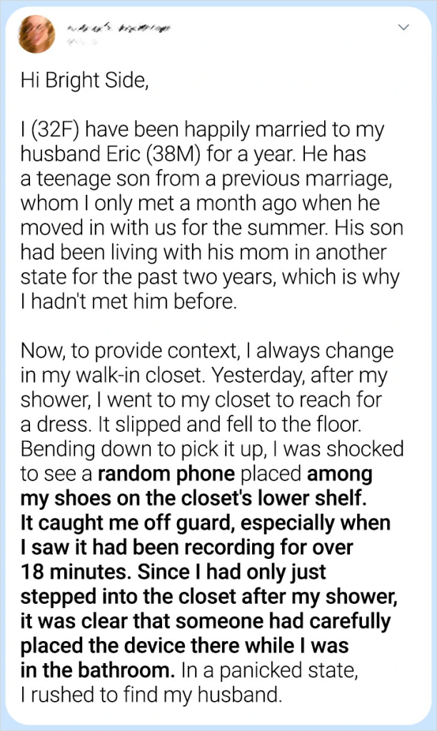 In conclusion, invasion of privacy goes beyond the violation of personal boundaries; it has the potential to erode trust and fuel deep anxiety. Recently, a lady found herself in a similar situation when she discovered an intruder’s phone in her wardrobe. Consumed by an intense sense of panic, she hastily sought comfort from her husband but was met with a callous and unsympathetic response. When she needed advice, she contacted Bright Side and wrote a heartfelt letter asking for guidance on how to deal with this difficult situation.