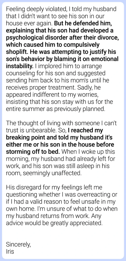 Set explicit limits on your stepson’s behavior and access to your residence to protect his own well-being. Still, it’s important to consider the emotional implications of your husband’s asking his stepson to vacate the premises, given his concern for his son’s psychological well-being. Don’t hesitate to rely on trusted friends or family members to help and guide you through this difficult time.