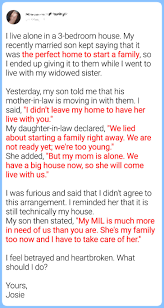 Yesterday my son told me that his mother-in-law is moving in with them. I was shocked and replied, “I didn’t give up my home so she could live with you.”