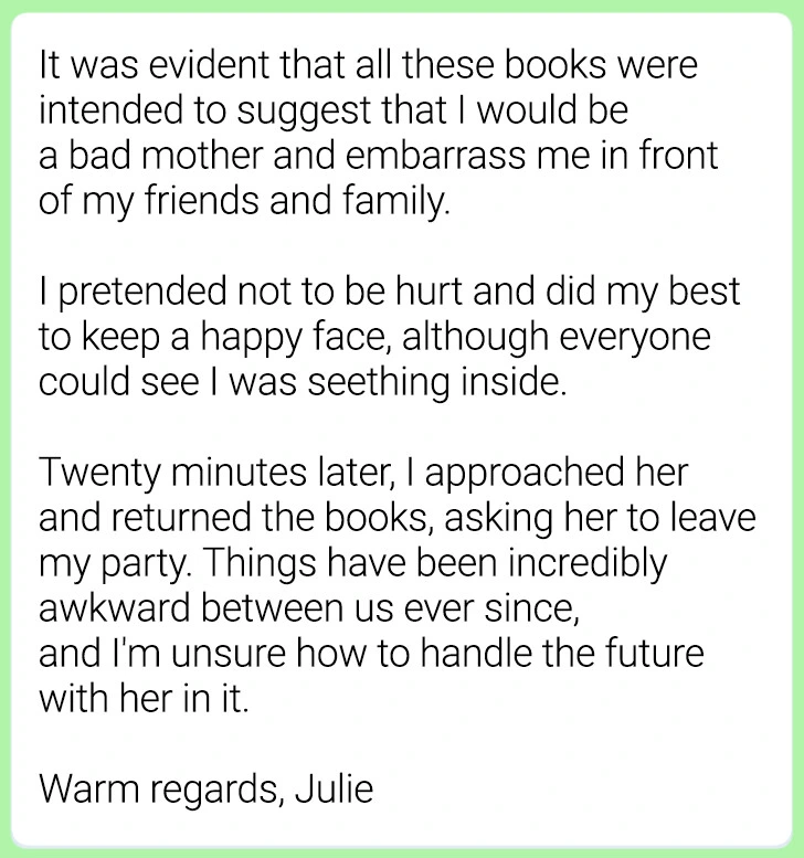 Dealing with family conflicts, especially those involving sensitive matters such as breastfeeding, can be particularly challenging. Julia’s situation, where her mother-in-law’s gift led to a strong emotional response, highlights the importance of setting boundaries and maintaining open communication.