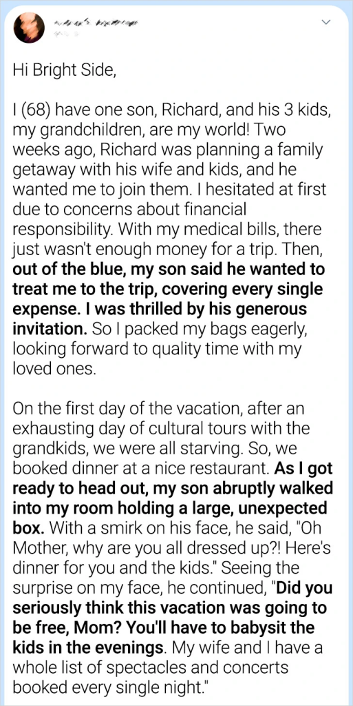 While traveling with her only son and his family, the grandmother found herself in a family dilemma.