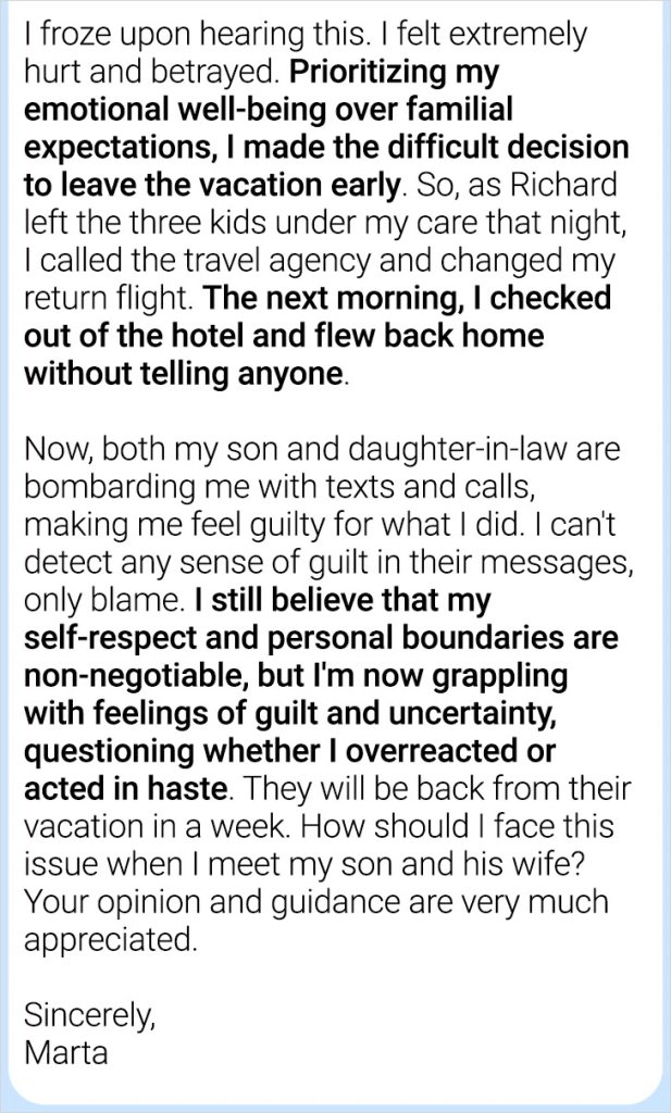 Your decision to shorten your journey was a bold statement of your worth. When you get over the problem with the son and daughter-in-law, keep that bravery. Remind yourself that you deserve to be respected and respected. Be clear and confident when conversing with them.