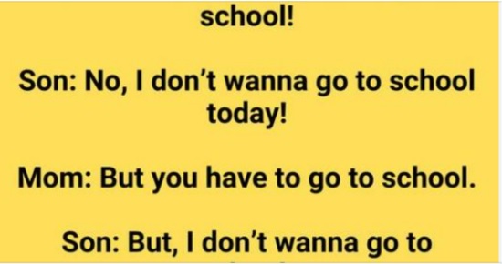 Mother: Give me three valid justifications why you ought to remain at home, and I will give you three motivations behind why you really want to go to class.