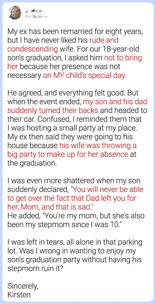 Family bonds are meant to be strengthened and united by special occasions. However, they can get complicated with blended families. Due to their strained relationship, Kirsten asked her ex-husband not to take his wife to her son’s graduation day. Then things got moving and Kirsten came to us for advice.