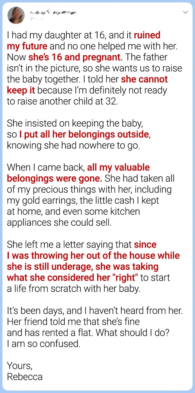 At the point when our peruser’s 16-year-old girl reported she was pregnant and needed to keep the child, she wanted to bring up her kid with her mother’s assistance.