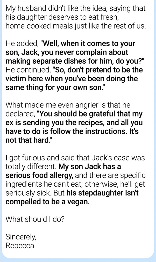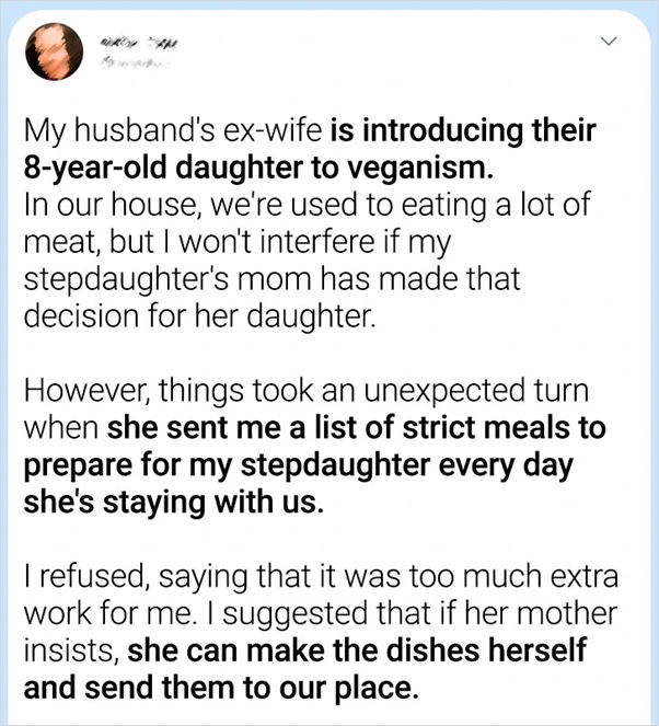 Each family encounters clashes, and in mixed families, these contentions can turn out to be significantly more complicated. Rebecca experienced a tough spot when her stepdaughter’s mom demanded she get ready separate feasts to suit the kid’s vegetarian diet.