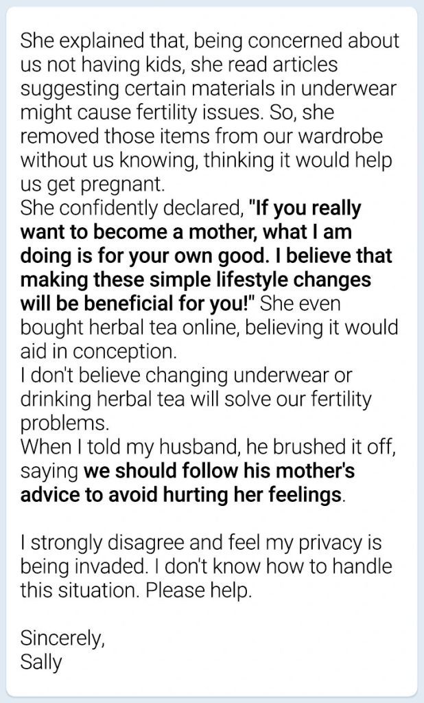 When family dynamics intersect with personal matters such as fertility, finding a balance between support and privacy becomes critical. Sally’s experience with her mother-in-law’s well-intentioned but intrusive actions underscores the need for open communication and boundary setting. By engaging in education together, seeking professional guidance, creating personal spaces, and redirecting energy into positive pathways, Sally is able to navigate this challenging situation while maintaining her privacy and emotional well-being. It is necessary to solve such problems with empathy and understanding, to realize the importance of maintaining healthy relationships in the family, while at the same time promoting individual autonomy and boundaries.