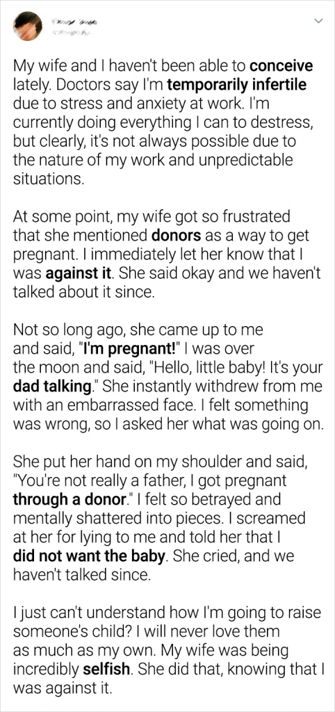 When a couple learns they are expecting a baby, some of them are ecstatic. However, it is less rosy if one of the couples is infertile for a while and does not know about his wife’s pregnancy at all. This reader experienced exactly this. He will have to choose between staying with his wife and raising the child.