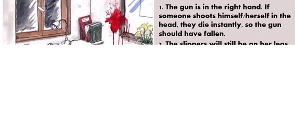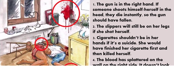 There is a weapon in the other hand. Books and a light are on the counter. A huge blood stain gives off an impression of being on the wall. It seems as though the individual has pulled the trigger on the weapon and serious suicide.However, assuming that you check out intently at the body, some say that it’s a homicide.