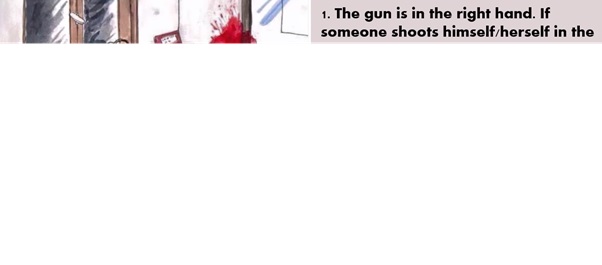 The individual is left-given, and the weapon is in the right hand, which proposes that the individual could never have shot a firearm with that hand. The weapon is pointed the other way of the blood splatter. Assuming it was self destruction, the body would deliver strain, which would make the individual drop the cigarette. Since these issues are found in the picture, apparently the individual has been killed.