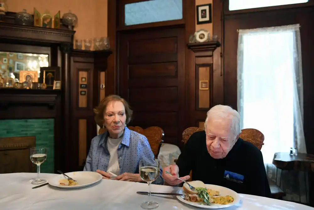 Jimmy Carter dines with his wife, former first lady Rosalynn Carter while answering the media at Jill Stuckey’s home on Saturday, August 4, 2018, in Plains, Georgia. President Carter grew up in the Georgian village of Plains, where he was also born.