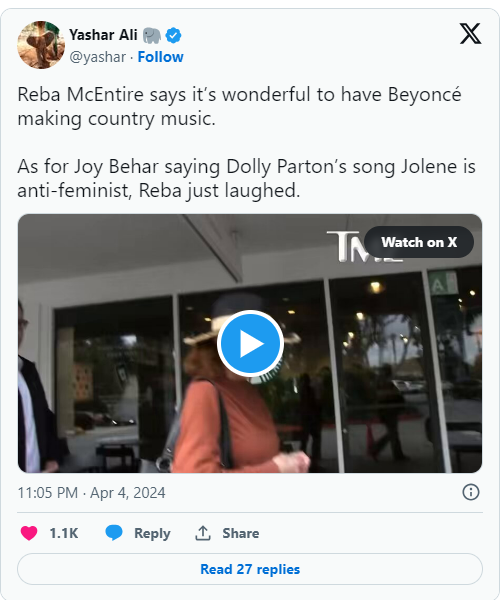 Naturally, many people — including country music icon Reba McEntire — had comments on the matter. McEntire just laughed and praised Beyoncé for her contributions to country music when asked about Joy Behar’s remark.