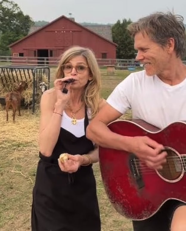 Bacon, 64, said, “Saturday in the park / I think it was the Fourth of July,” as Sedgwick, 57, swayed between the couple’s goats and pigs. Sedgwick added her husband’s kazoo to the song while she balanced on some goat droppings on the ground.