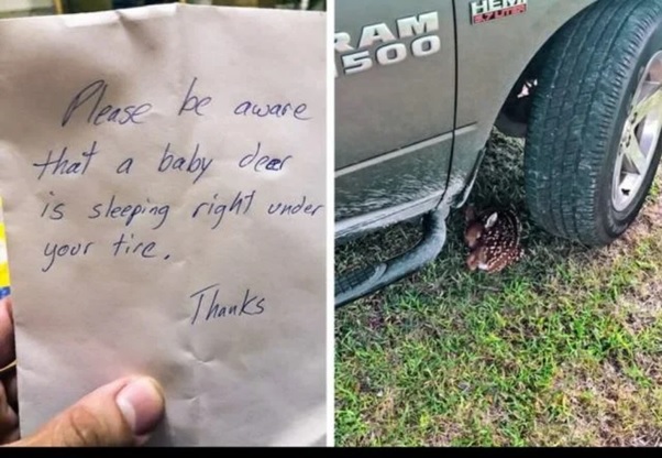 A lady needed to ensure the vehicle’s driver knew that a child deer was resting underneath a tire, so she shared this Facebook post, which immediately acquired notoriety.