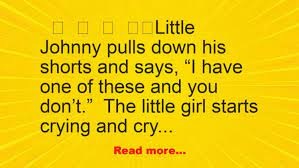 Little Johnny and a young lady are playing. Little Johnny pulls down his shorts and says, “I have one of these and you don’t.” The young lady…