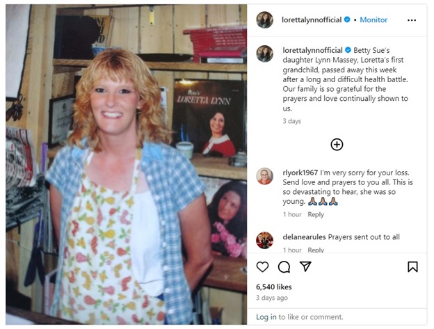 “Betty Sue’s little girl Lynn Massey, Loretta’s most memorable grandkid, pa:ss:ed away this week after a long and troublesome wellbeing fight. Our family is so thankful for the requests and love ceaselessly displayed to us,” they composed on Loretta’s true Instagram page.