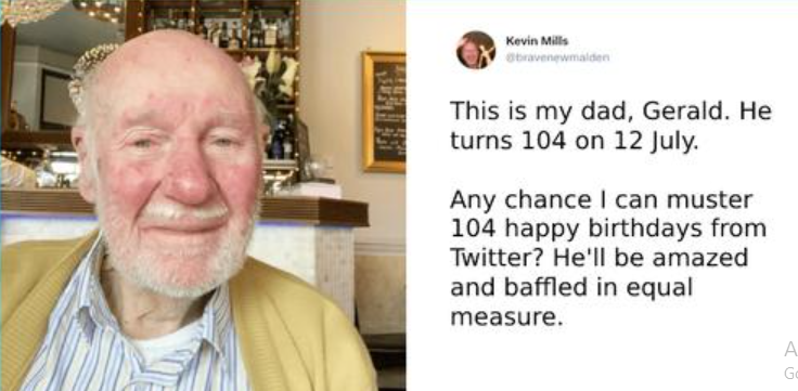 Gerald was undoubtedly one, of them and was honored beyond his wildest dreams. It all started when his son Kevin Mills posted on Twitter that his father was 104 years old and asked for birthday wishes. Additionally, Mills posted a sweet photo of his dad. “This is Gerald, my father. He will be 104 on July 12,” Mills tweeted. “Is there any chance I’ll have 104 birthdays on Twitter? He’ll be amazed and confused at the same time. A direct birthday wish has evolved into a sweet thread where individuals have shared birthdays and photos of their loved ones, most of them showing off elderly grandparents.