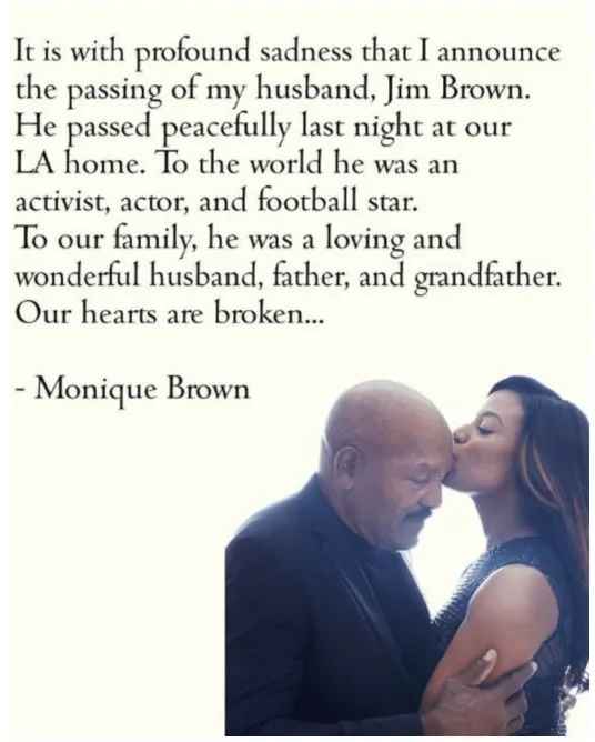 Jim Brown’s loving wife, Monique Brown, confirmed this awful truth in a heartfelt Instagram post. She wrote: “It is with deep sadness that I announce the passing of my husband Jim Brown from this mortal realm,” and posted a cute picture of her and her beloved Jim kissing.