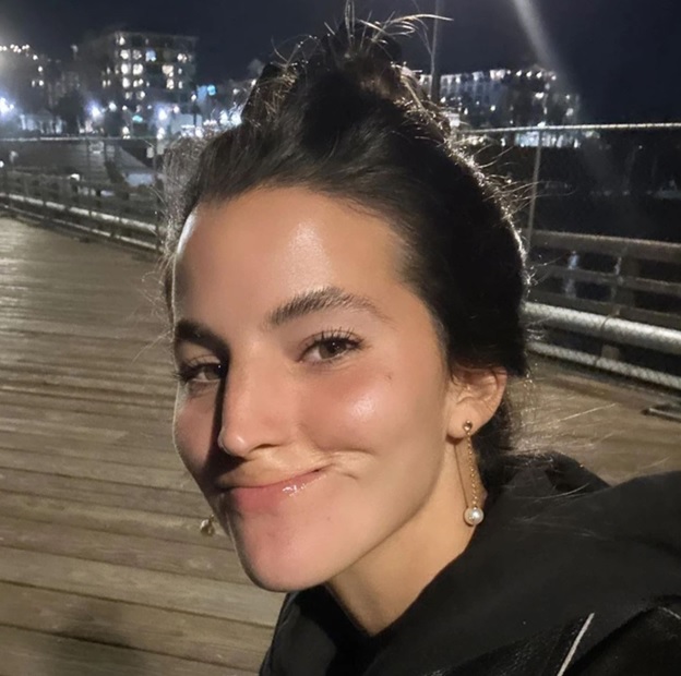 Close up of Brooklinn Khoury. Structures, railings, and night sky behind the scenes.