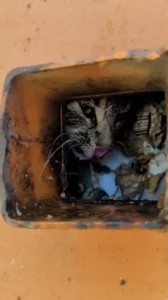 The mother was definitely trying to take care of her newborn kitten the whole time and it was obvious that she hadn’t been fed for at least a few days. Perhaps they perished in the heat or were crushed by falling cardboard. Even though the mother and son team of rescuers knew the odds were clearly against them, they never gave up. As they tried to get to her, they were able to feed the mother cat through the hole in the container.
