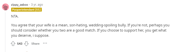 “Consider this: your wife ruined the wedding, is cruel, and doesn’t seem to like your son. Another Reddit user suggested the following: “Maybe you should consider whether you’re a good match if you don’t agree.