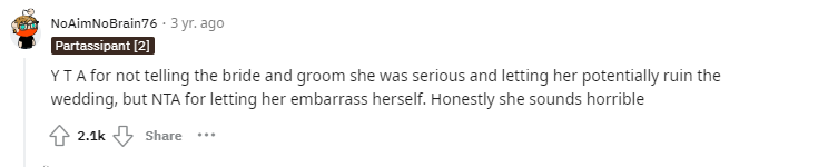 According to one user, “Y T A could have ruined the wedding by not telling the bride and groom that she was serious, but NTA allowed her to humiliate herself.” Sounds awful, to be honest.”