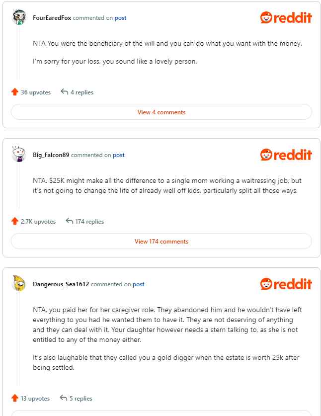 Through her story, she sheds light on the challenges she faced as a stepmother and the tough decisions she made regarding her husband’s estate. Despite criticism and resentment from her stepchildren and ex-wife, she stood by her decision to leave her inheritance to someone who had supported her family through difficult times. Responses from Redditors reflect a range of opinions, with many expressing empathy for her situation and defending her actions as justified under the circumstances.