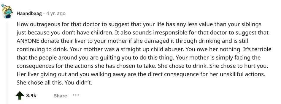 Empathizing with her plight, Reddit users urged her to prioritize her well-being and life choices over succumbing to family pressure. The consensus was leaning towards supporting her decision to refuse liver donation given the turbulent history and possible risks.