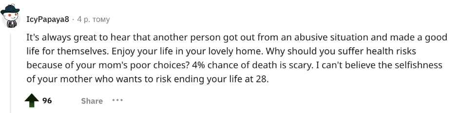 Other Redditors shared their thoughts in the comments section after reading the woman’s detailed article. She should “think of herself” rather than let her mother operate, the person suggested.
